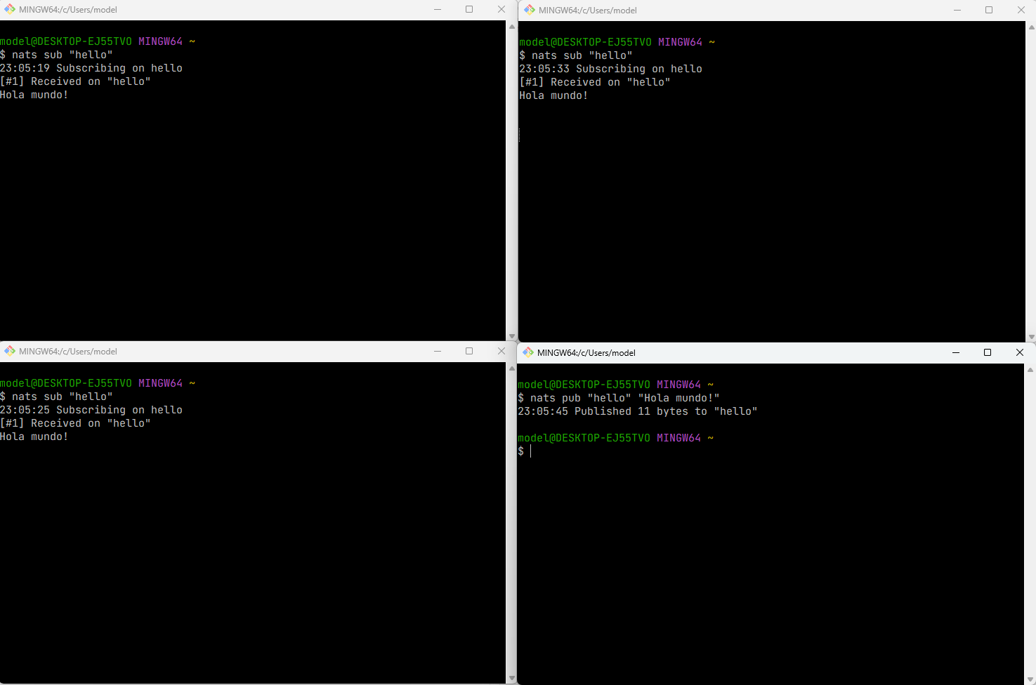 nats sub "hello"lo cual significa que se está suscribiendo al canalhello. Y en otra escribir:nats pub "hello" "Hola mundo!", lo cual significa que está escribiendo el mensajeHola mundo!en el canalhello.